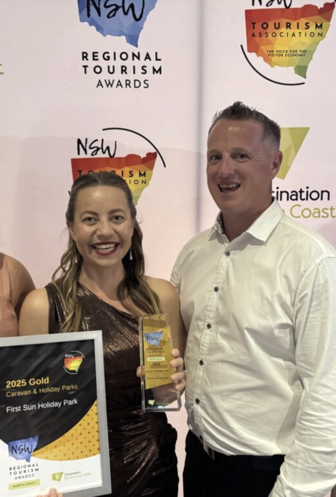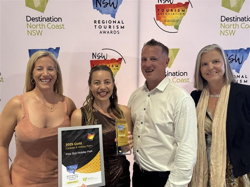 First Sun Holiday Park lit up the stage at the 2025 North Coast NSW Regional Tourism Awards, taking home the coveted Gold Award for Caravan and Holiday Parks. The Byron Bay favourite had plenty to celebrate, with the powerhouse team beaming as brightly as the sun they’re famous for.