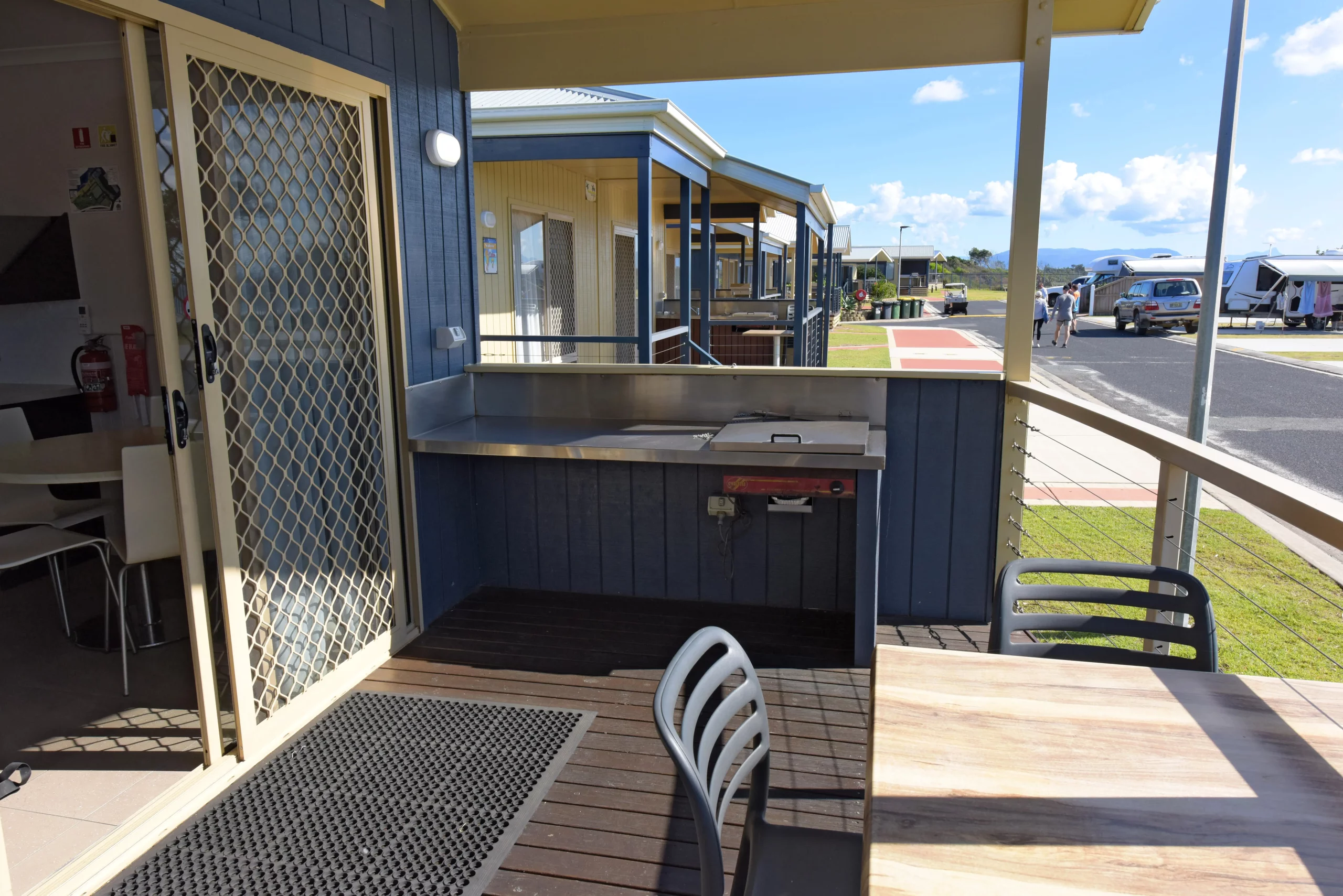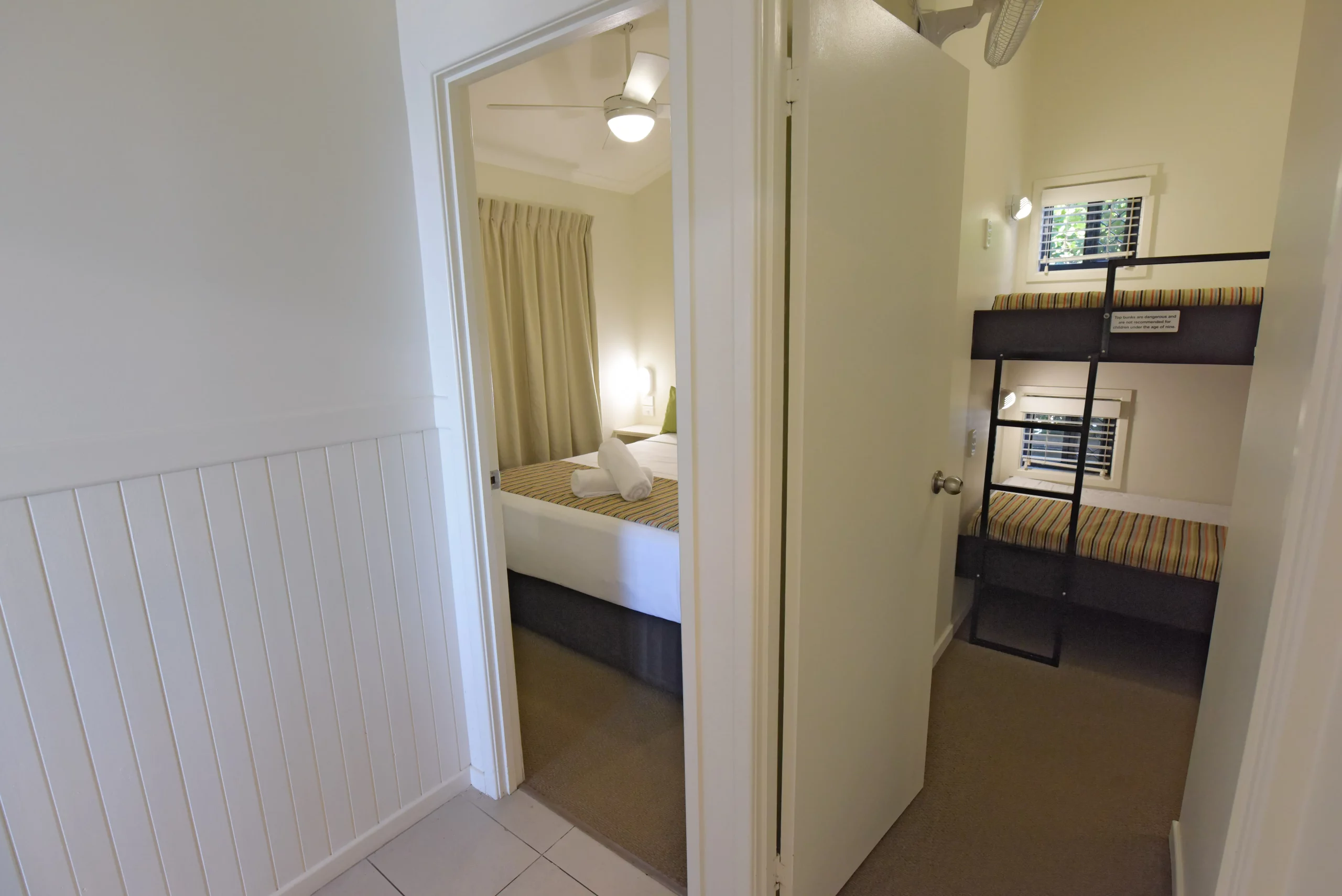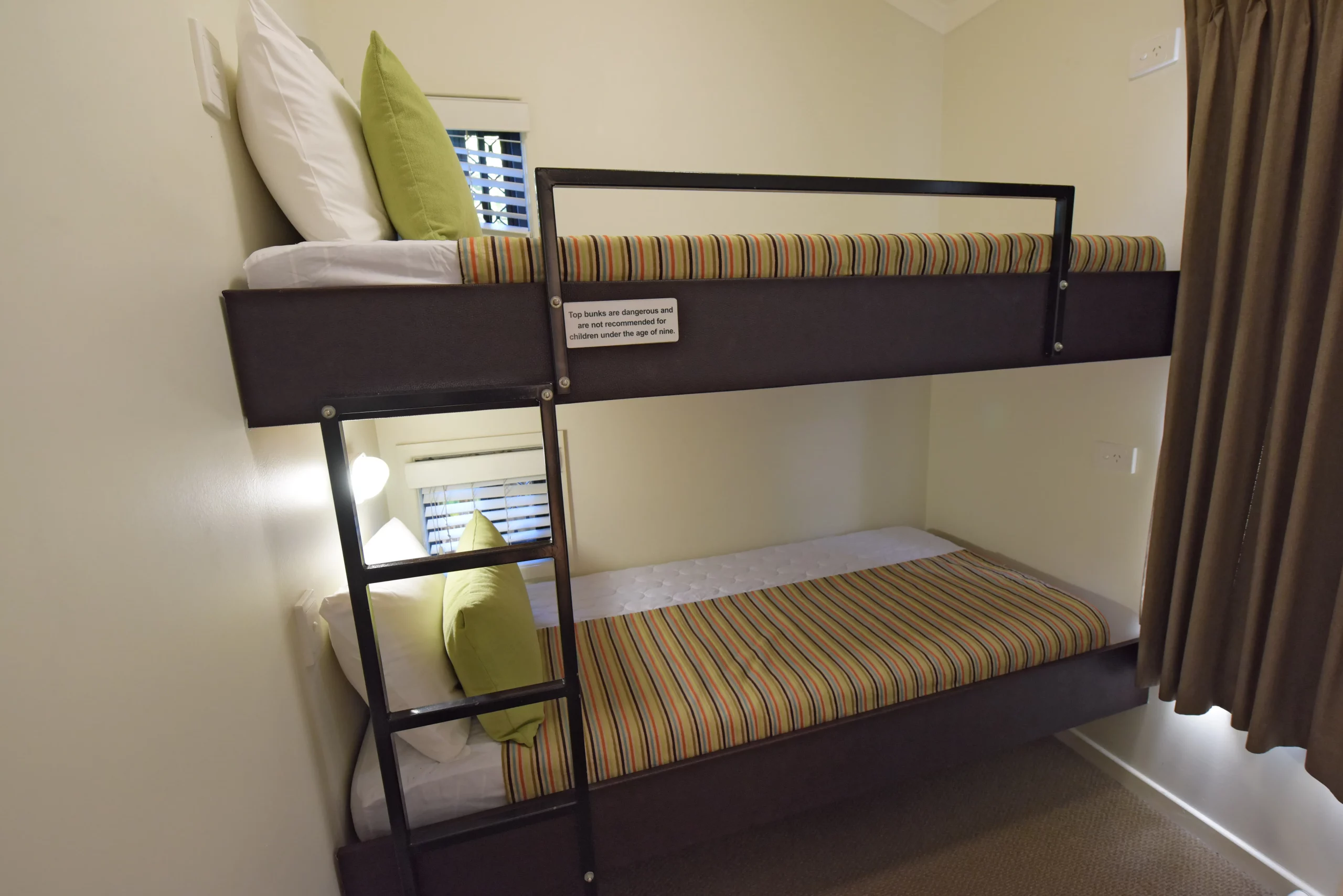We have three 2 Bedroom Ocean View Cabins available. The main bedroom has a Queen size bed, the second bedroom has two single bunk beds.